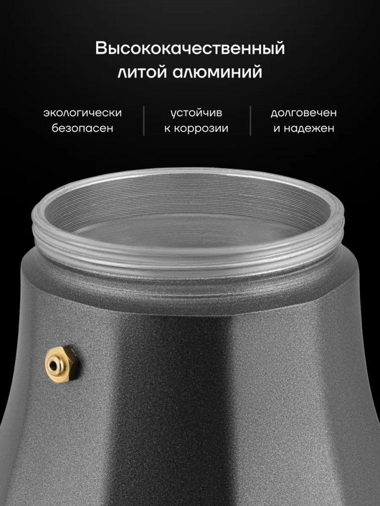 Алюминиевый гейзер с крышкой - отличное решение для поклонников эспрессо. Он намного удобнее, чем металлическая или керамическая турка, ведь с ним не нужно следить за процессом приготовления напитка и бояться испачкать кухню. Также кофейник станет прекрасной альтернативой кофемашине. Объем готового напитка составит 450 мл, это 9 чашек крепкого насыщенного кофе за 5 минут.