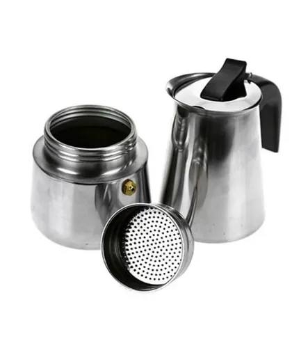 Практичная, надёжная кофеварка из нержавеющей стали прослужит длительное время. Классический дизайн. Ручка и кнопка выполнены из прочного нейлона. Предохранительный клапан давления. Главный принцип гейзерной кофеварки — прохождение кипящей воды не сверху вниз под давлением или действия силы тяжести (как в капельных кофеварках или экспресс-машинах), а снизу верх (закипающая вода поднимается в виде пара). Гейзер состоит из нижней ёмкости для воды специального сита-фильтра для кофе и верхнего чайника для уже готового напитка. Истинным кофеманам отлично подойдет гейзерная кофеварка с минималистичным дизайном, которая впишется в любой интерьер кухни. Гейзерная кофеварка подойдет для компании на 2, 4, 6 или 9 человек.Корпус выполнен из утолщенной стали. Подходит для всех видов плит, кроме индукции. Не подходит для посудомоечной машины.Важно! Необходим кофе среднего помола.