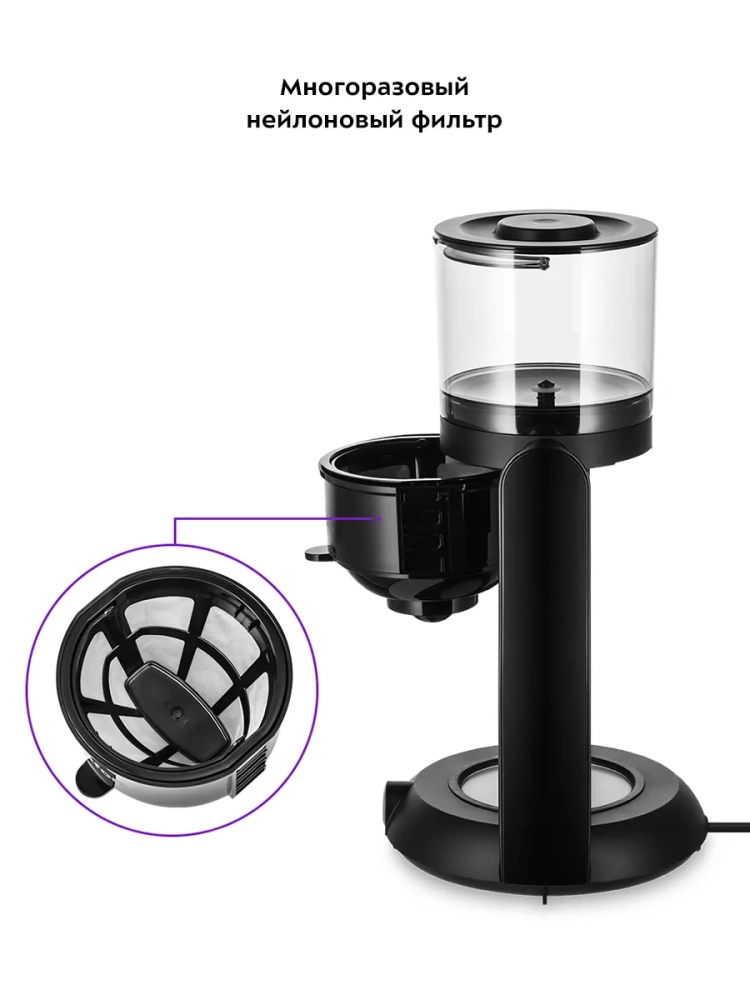 Кофеварка оборудована противокапельной системой — затвором, приостанавливающим подачу кофе при вынимании кофейника из прибора. Вы можете налить кофе в чашку, не дожидаясь окончания приготовления.