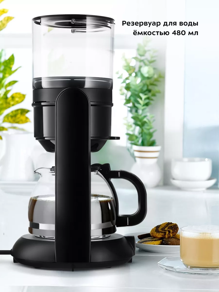 Резервуар для воды емкостью 480 мл позволяет за один раз приготовить кофе на 2 больших (по 250 мл) или 5 маленьких (по 100 мл) чашек. Корпус кофейника прозрачный, поэтому вы всегда можете видеть, сколько кофе еще осталось.