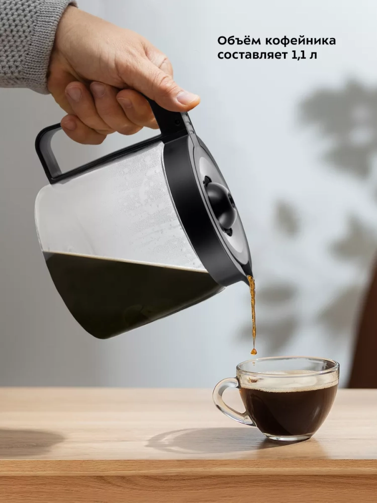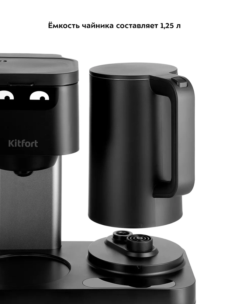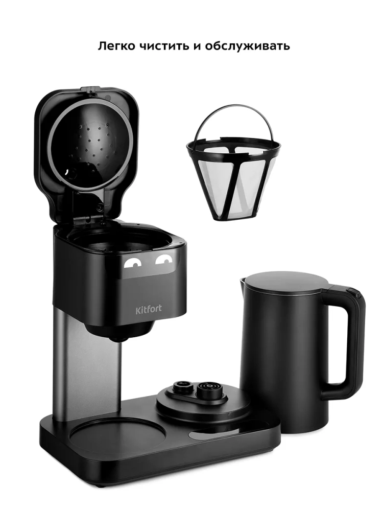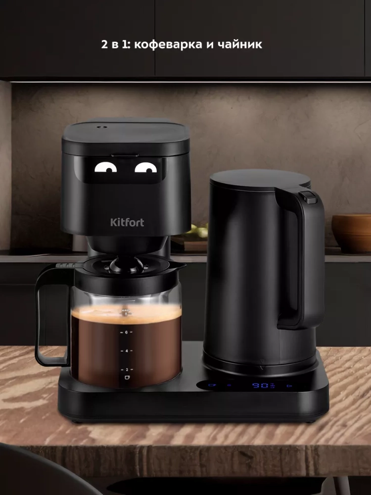 Кофеварка Kitfort «2 в 1» КТ-7143 совмещает в себе два устройства — чайник и капельную кофеварку. С помощью кофеварки «2 в 1» вы можете вскипятить воду и приготовить ароматный черный кофе.