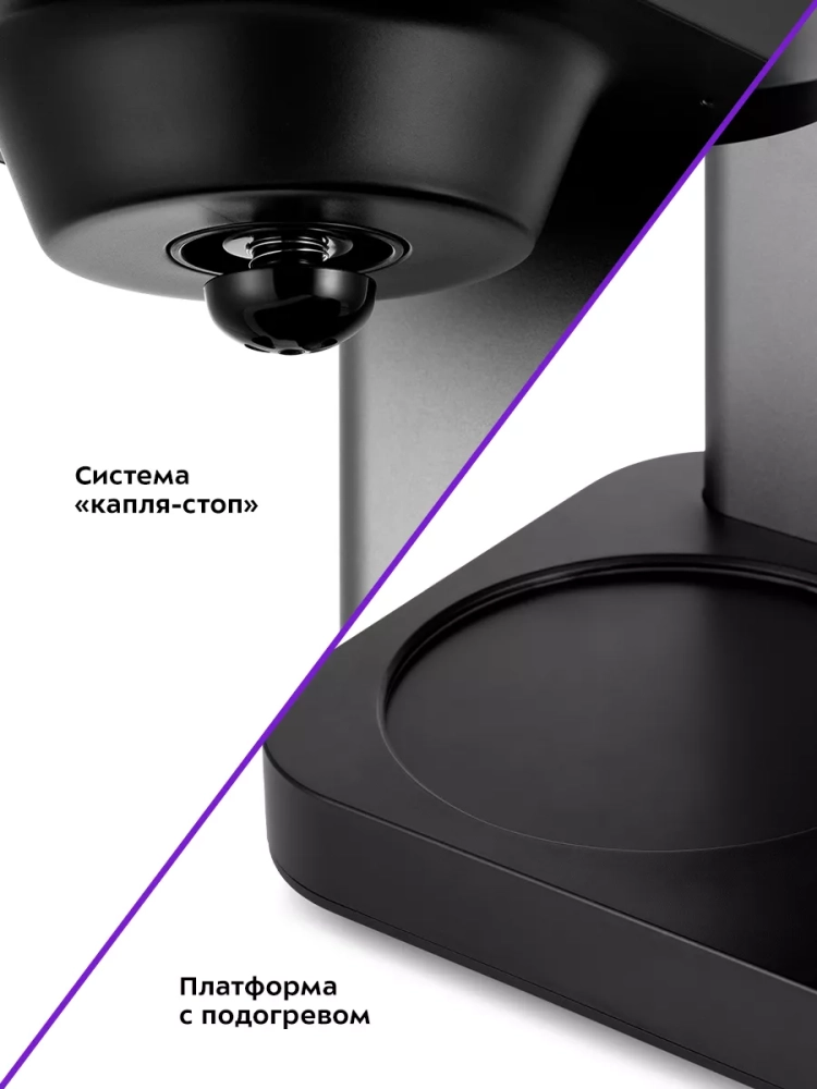 Воронка кофеварки оборудована противокапельной системой — затвором, приостанавливающим подачу кофе при вынимании кофейника из кофеварки.