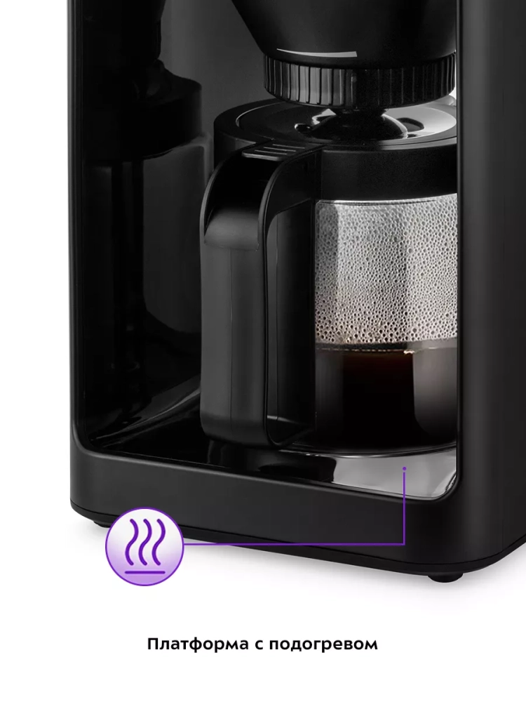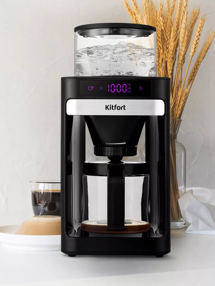 Капельная кофеварка Kitfort КТ-7144 готовит ароматный черный кофе из молотого кофе.