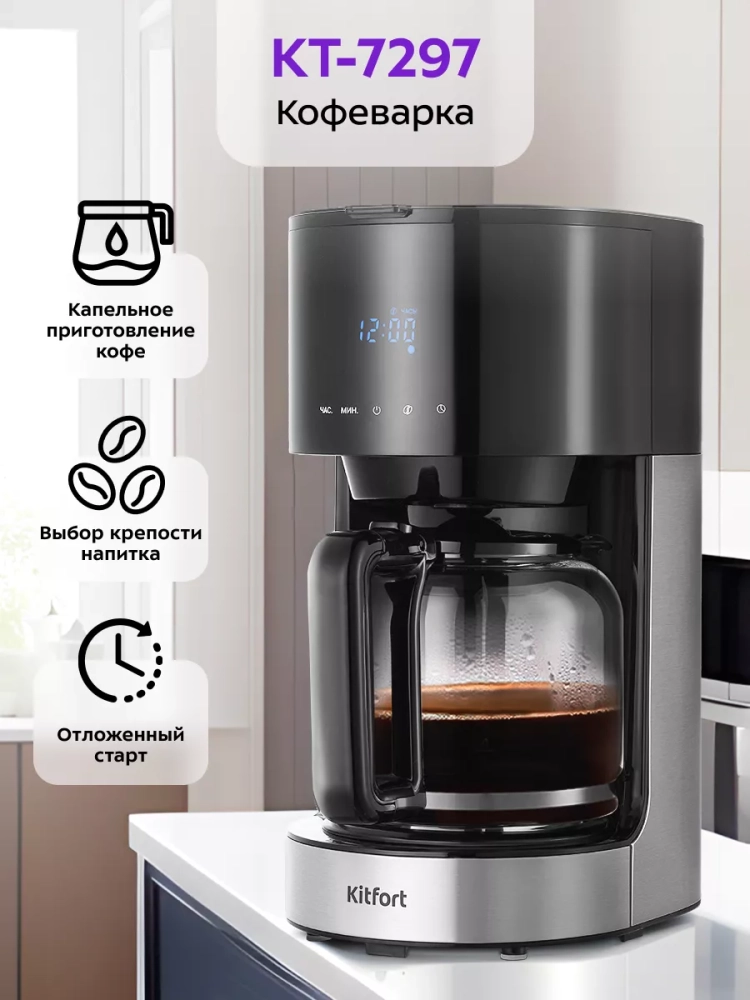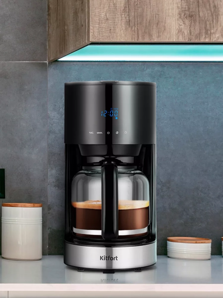 Капельная кофеварка Kitfort КТ-7297 готовит ароматный черный кофе из молотого кофе. Вы можете выбрать степень крепости кофе.
