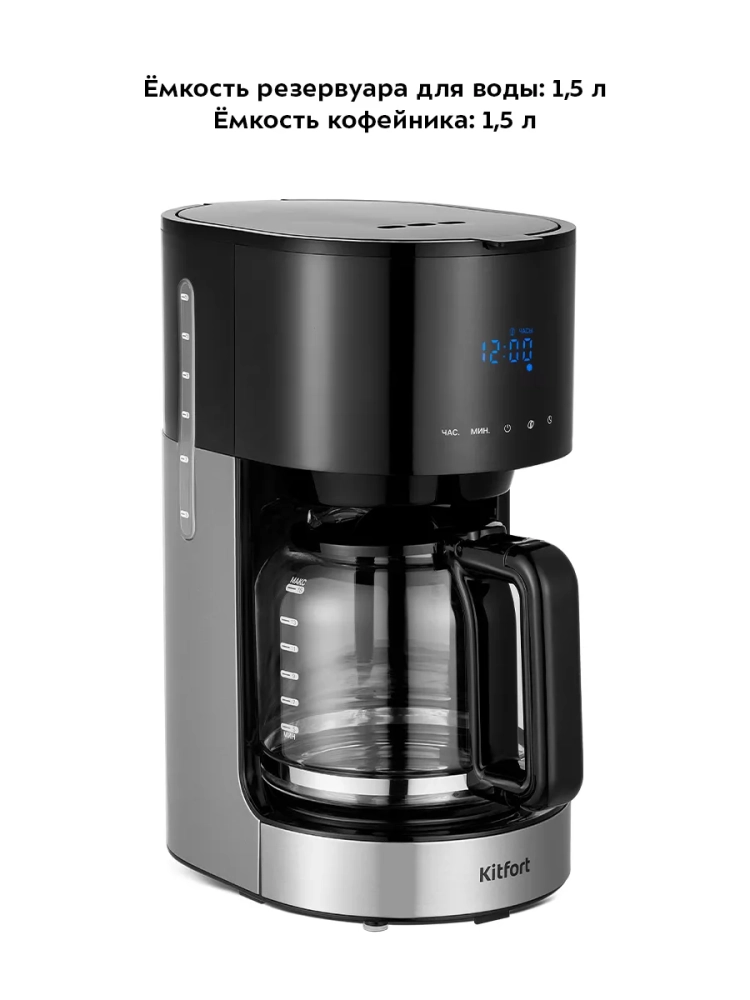 Резервуар для воды емкостью 1,5 л позволяет за один раз приготовить кофе на 15 чашек (по 100 мл). На резервуаре для воды и кофейнике нанесены соответствующие отметки, поэтому вам будет удобно приготовить нужное количество чашек кофе. Кофейник стеклянный, поэтому вы всегда можете видеть, сколько кофе осталось.