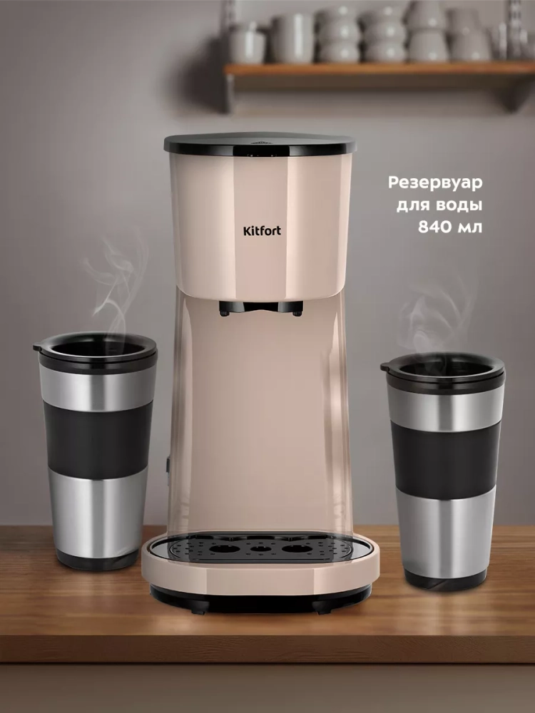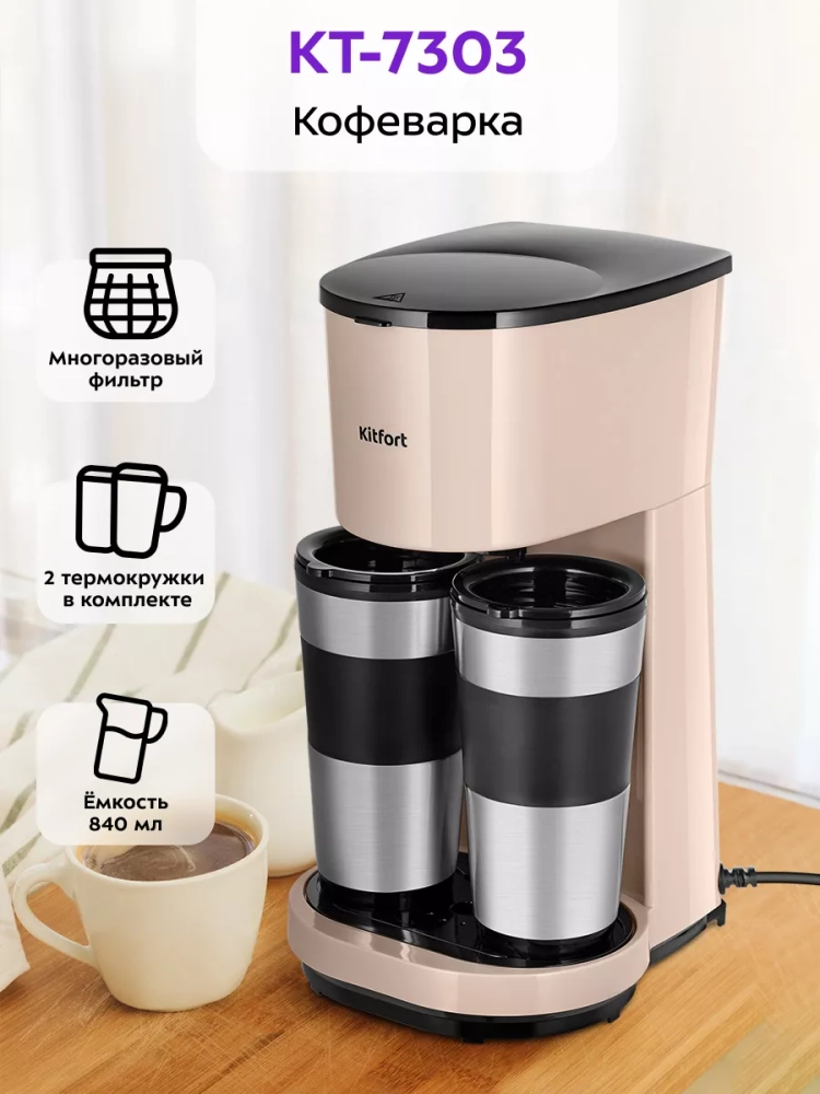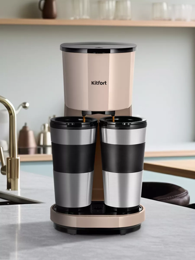 Капельная кофеварка Kitfort КТ-7303 готовит ароматный черный кофе из молотого кофе одним нажатием кнопки. Прибор предназначен для приготовления двух порций кофе одновременно.