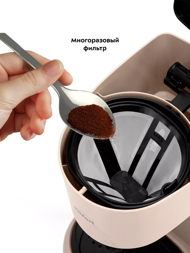 В кофеварке горячая вода медленно поступает в фильтр с молотым кофе. Многоразовым фильтром можно пользоваться неограниченное количество раз. Пройдя через него, вода попадает в термокружку, которая сохранит тепло вашего кофе. В комплекте идут две термокружки из нержавеющей стали и пластика, что позволяет сохранить напиток теплым. Отверстие для питья имеет удобную форму и закрывается крышкой, поэтому вы сможете взять кофе с собой и пить на ходу.