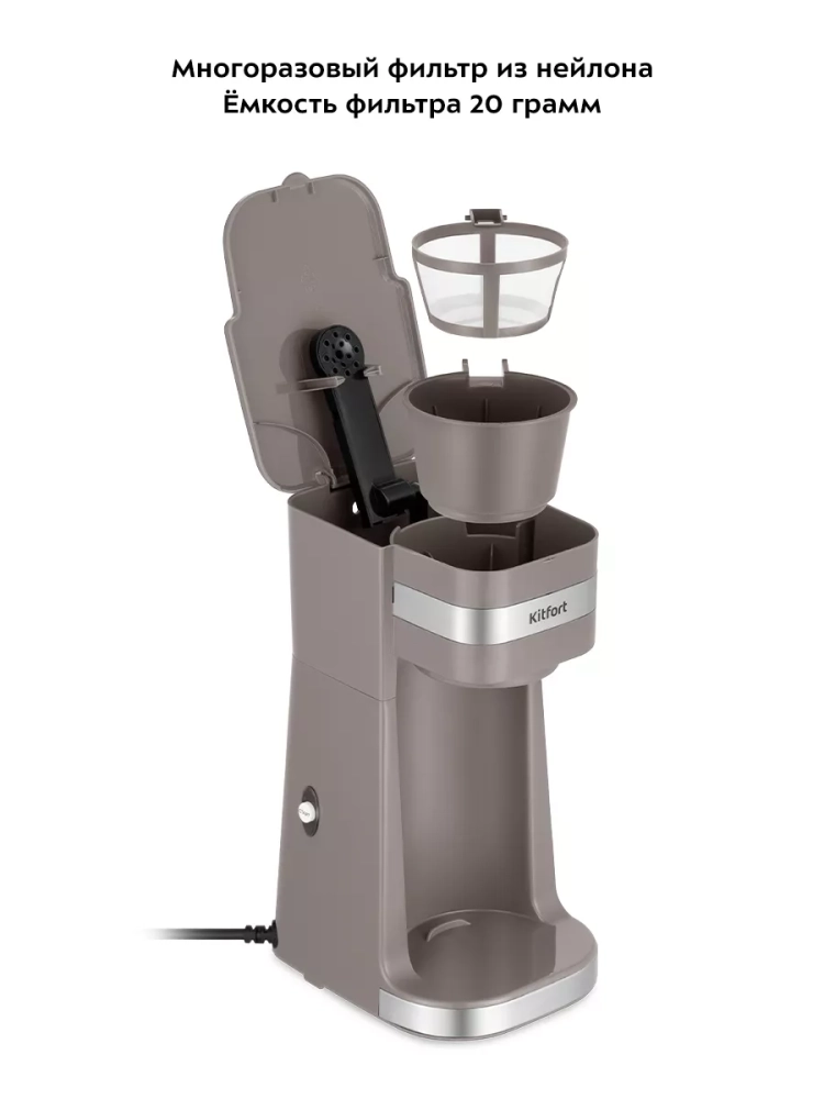 Кофеварка Kitfort оснащена многоразовым фильтром, что позволяет экономить на покупке одноразовых фильтров и заботиться об экологии. Металлический фильтр-сетка легко моется и обеспечивает качественную фильтрацию молотого кофе. Управление кофеваркой осуществляется с помощью удобной кнопки включения, что делает её использование простым и интуитивно понятным.