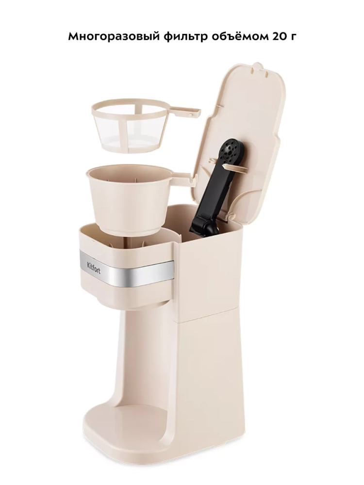 Эта кофеварка оснащена системой капельного типа, которая позволяет использовать молотый кофе для приготовления ароматного напитка. Кофеварка Kitfort имеет многоразовый фильтр, что делает её использование более экономичным и экологичным. Съемная крышка и фильтр облегчают процесс очистки и обслуживания техники.