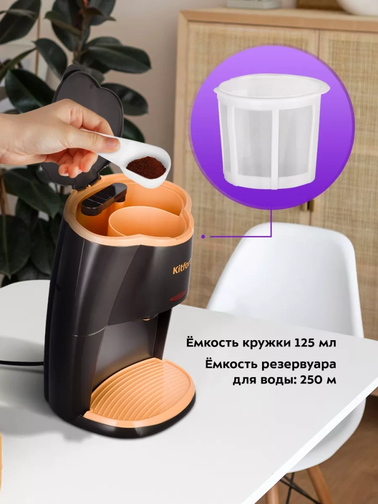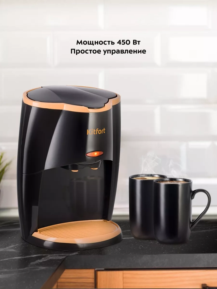 Капельная кофеварка Kitfort КТ-7399 готовит ароматный черный кофе из молотого кофе. Кофеварка отличается компактностью и поместится на любой кухне. Она позволяет легко и быстро приготовить кофе на две кружки одновременно.