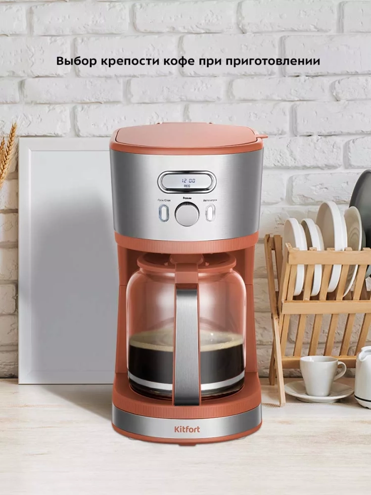 Капельная кофеварка Kitfort КТ-7445 готовит ароматный черный кофе из молотого кофе.