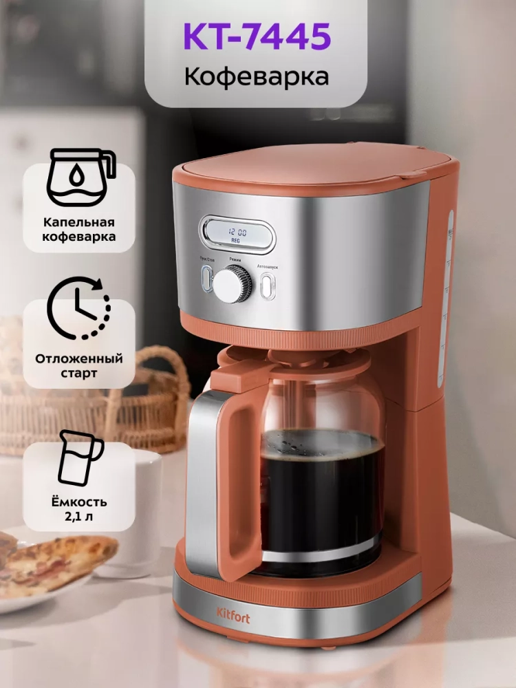 Кофеварка KT-7445 оборудована дисплеем, который показывает текущее время и режим работы. Функция отложенного старта позволит начать приготовление в заданное время. Вам больше не придется вставать утром заранее, чтобы успеть сделать себе ароматный кофе.