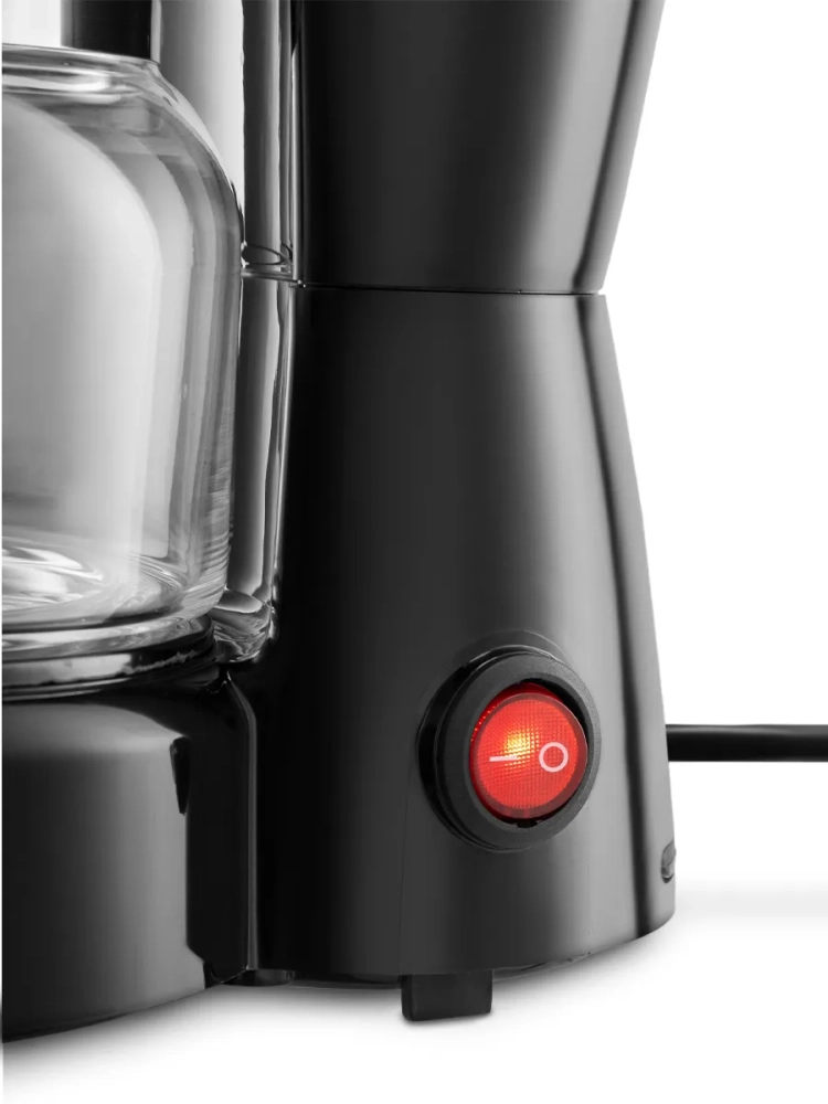 Резервуар для воды емкостью 0,75 л позволяет за один раз приготовить кофе на 5 чашек (по 150 мл). Внутри резервуара для воды и на кофейнике нанесены соответствующие отметки (5-я, максимальная отметка, не нанесена, т. к. в этом месте находится металлический ободок), ввиду чего вам будет удобно приготовить нужное количество чашек кофе. Кофейник стеклянный, поэтому вы всегда можете видеть, сколько кофе осталось.
