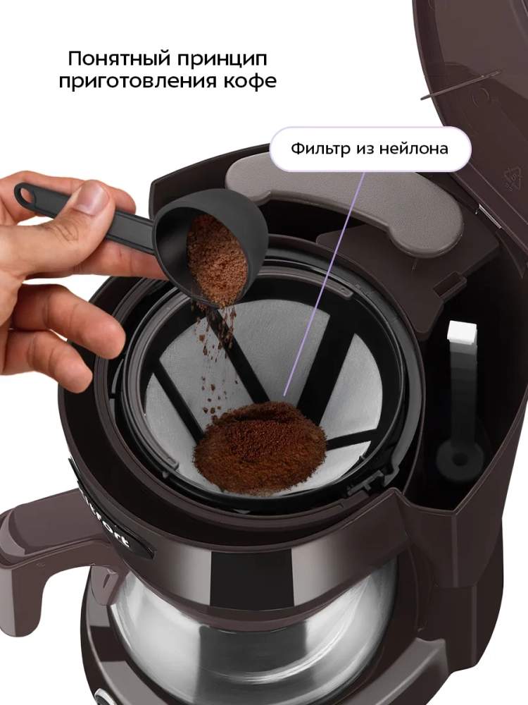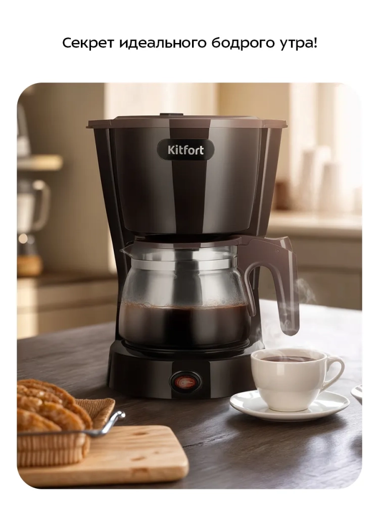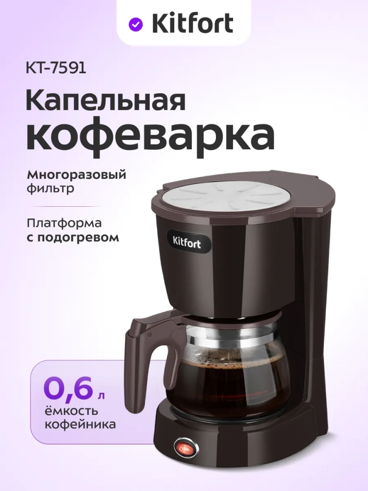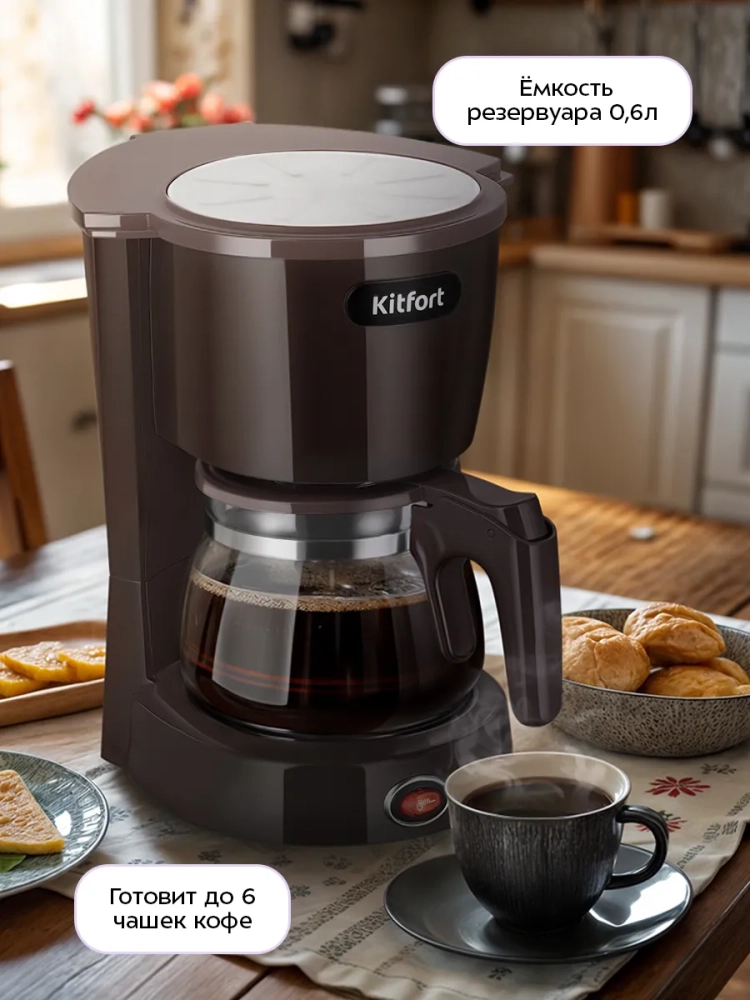 Капельная кофеварка Kitfort КТ-7591 готовит ароматный черный кофе из молотого кофе.