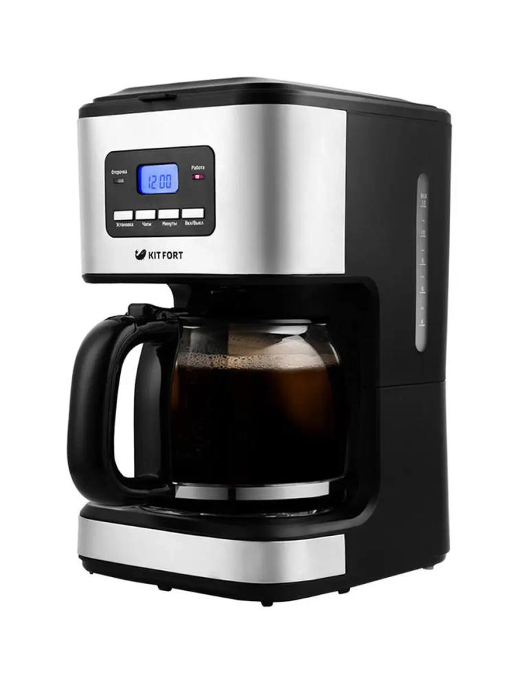 Капельная кофеварка Kitfort КТ-719 поможет приготовить ароматный кофе. В капельной кофеварке вода доводится до температуры 70–80 *С, после чего медленно поступает в фильтр с молотым кофе. Пройдя через него, она попадает в кофейник. По окончании приготовления кофеварка перейдет в режим подогрева. Платформа с подогревом, на которой стоит кофейник с готовым кофе, будет горячей в течение 40 минут, затем кофеварка выключится. Кофеварка оборудована противокапельной системой — затвором, приостанавливающим подачу кофе при вынимании кофейника из кофеварки. Вы можете налить кофе в чашку, не дожидаясь окончания приготовления. Резервуар емкостью 1,4 л позволяет за один раз приготовить кофе на 12 чашек (объемом 100 мл). Корпус кофейника прозрачный, поэтому вы всегда можете видеть, сколько кофе еще осталось. Кофеварка Китфорт КТ-719 предназначена для приготовления кофе в домашних условиях или в офисе.
