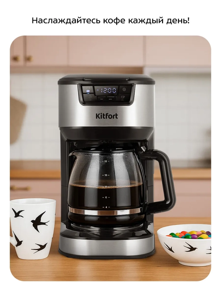 Капельная кофеварка Kitfort КТ-7539 готовит ароматный черный кофе из молотого кофе.