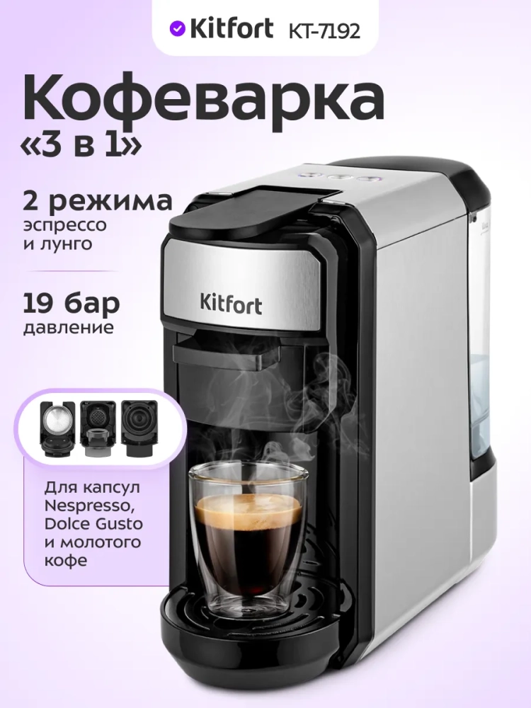 Кофеварка Kitfort КТ-7192 (3 в 1) — это универсальное устройство, которое сочетает в себе функции капсульной и рожковой кофеварки. Она идеально подходит для использования с капсулами Nespresso и Dolce Gusto, а также для молотого кофе. Это делает её отличным выбором как для любителей классического эспрессо, так и для тех, кто предпочитает более сложные напитки с молочной пенкой. Эта кофеварка позволяет быстро приготовить эспрессо всего за 25 секунд или лунго за 47 секунд. Благодаря капучинатору вы сможете самостоятельно создавать воздушную пенку для вашего любимого капучино. Съемный резервуар для воды и три адаптера делают использование устройства простым и удобным. Кофеварка "3 в 1" от Kitfort предлагает уникальную возможность готовить кофе из капсул или использовать её как традиционную рожковую кофеварку. Это особенно удобно тем, кто ценит участие в процессе приготовления напитка и хочет экспериментировать с различными рецептами. Капсульные кофеварки обеспечивают быстрый процесс приготовления: достаточно поместить капсулу в адаптер — никаких дополнительных действий не требуется! Капсулы герметично упакованы, что позволяет долго сохранять свежесть кофе без необходимости измерять количество молотого продукта. Kitfort KT-7192 совмещает все преимущества различных типов кофемашин: скорость приготовления из капсул и возможность экспериментов с молотым кофе. Не забывайте о важности выбора сорта зерен — вкус зависит от степени обжарки и помола.
