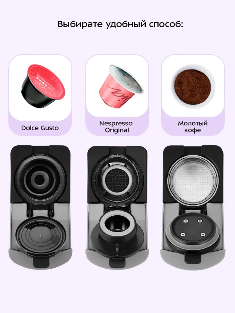 Капсульно-рожковая кофеварка поможет приготовить эспрессо, ристретто или лунго, а также другие виды кофе на ваш вкус.