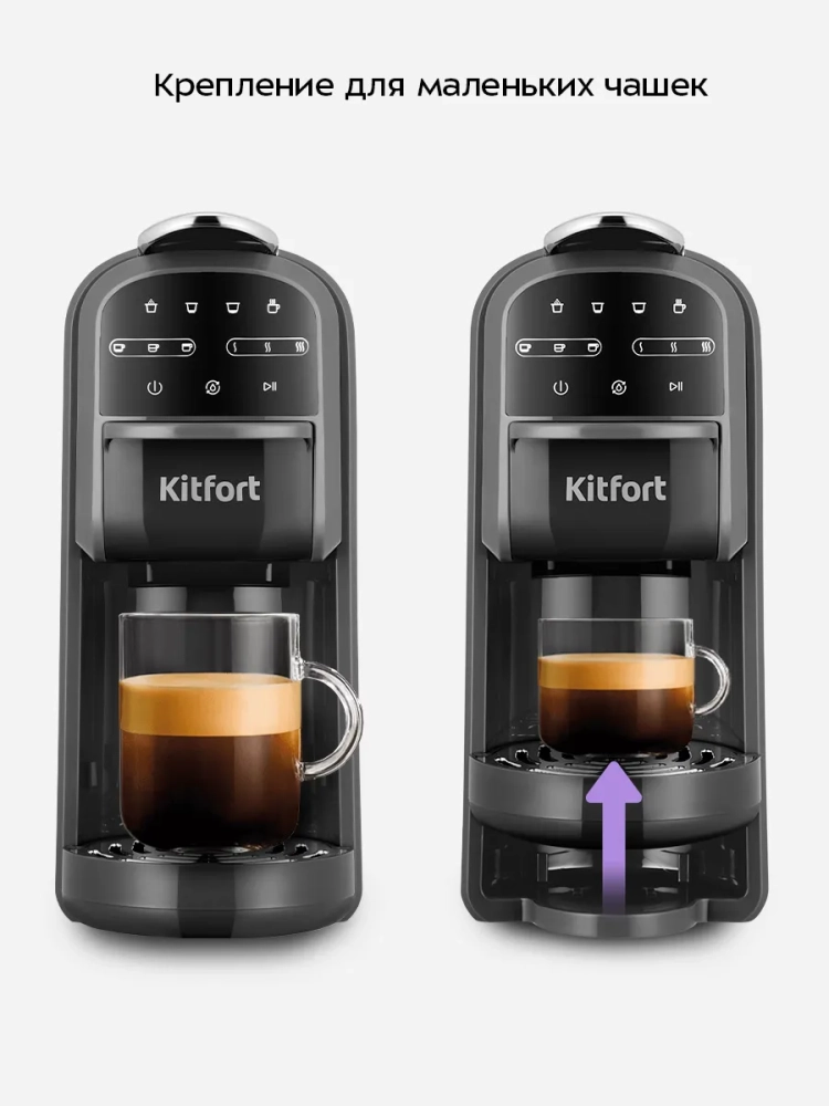Кофеварка «3 в 1» Kitfort КТ-7657 — многофункциональное устройство, сочетающее в себе функции капсульной и рожковой кофеварки. Благодаря адаптерам кофеварка подходит для молотого кофе, капсул типа Nespresso Original и Dolce Gusto, а также может подавать горячую воду температурой 55, 75 или 100 С.