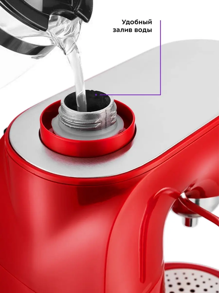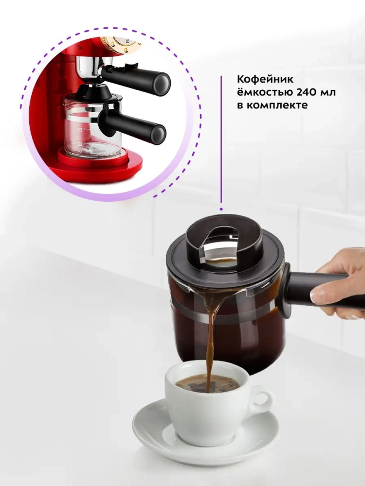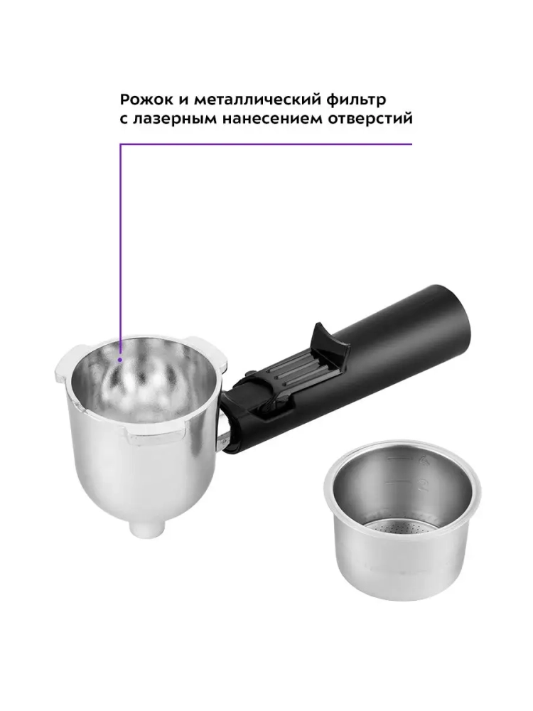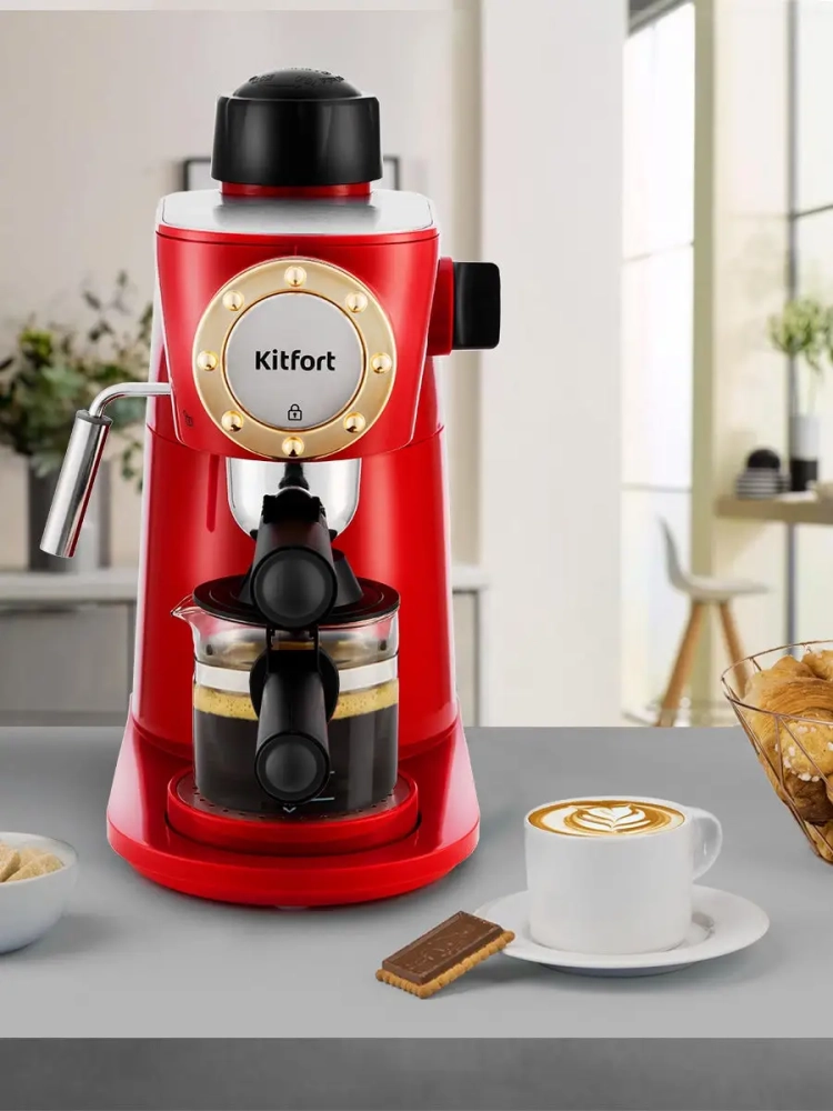Рожковая полуавтоматическая эспрессо-кофеварка КТ-756 поможет приготовить кофе эспрессо, капучино или латте, а также множество других видов кофейных напитков на ваш вкус. С помощью кофеварки вы можете подогреть паром остывший чай или молоко.Ключевым отличием рожковой кофеварки от всех остальных кофеварок, турок и прочих кофейных устройств является наличие рожка, также его часто называют холдер. Принцип действия кофеварки основан на пропускании горячей воды под давлением в несколько атмосфер через слой молотого кофе. В результате получается кофе без примеси гущи. Этот способ позволяет приготовить напиток, сохранив оригинальный вкус зерен. Еще одно значимое достоинство метода - быстрота приготовления кофе.Молочную пенку для капучино нужно делать самостоятельно. Капучинатор в кофеварке - это паровая трубка с насадкой панарелло. Его просто нужно погрузить в холодное молоко. При открытии пара в чашке взбивается густая молочная пена.