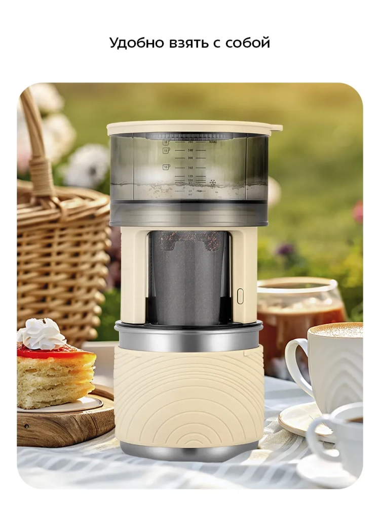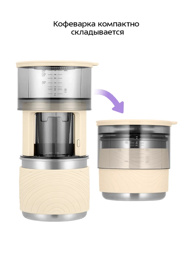 Кофеварка компактно складывается и занимает мало места, она удобна в использовании, а благодаря работе от батареек вы можете взять ее с собой куда угодно.