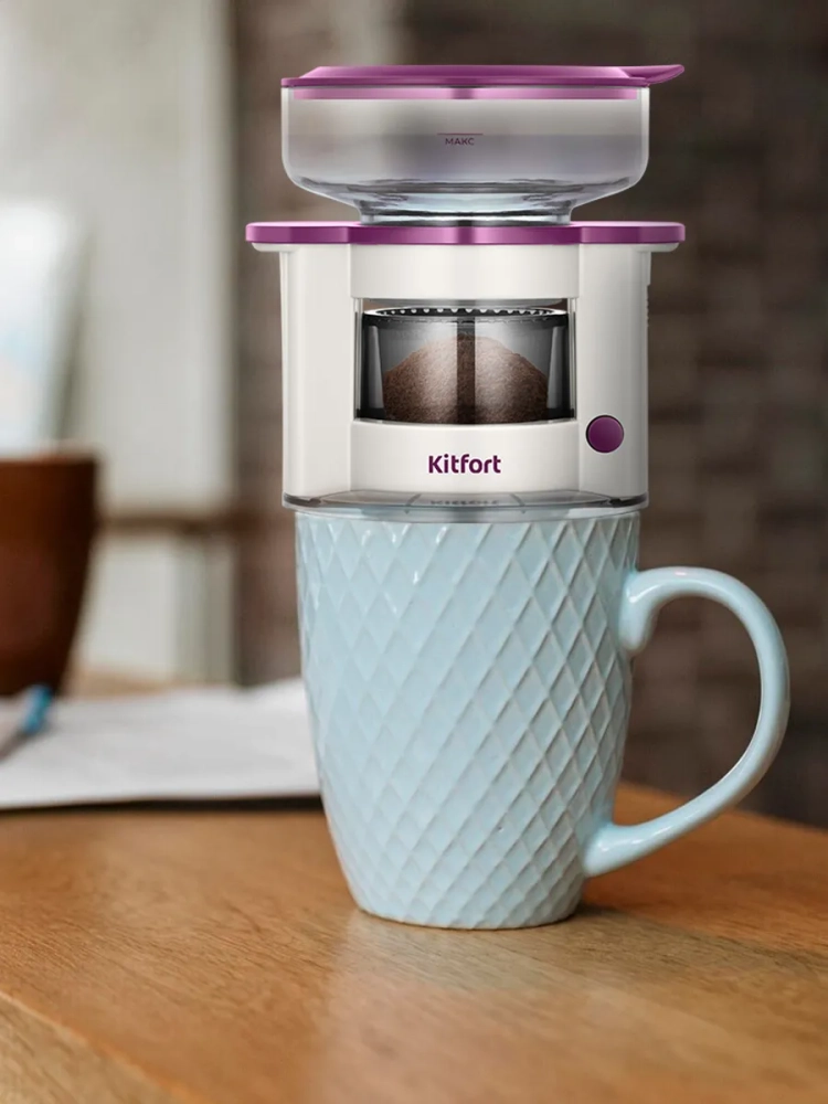 Портативная кофеварка Kitfort КТ-7576 готовит ароматный черный кофе из молотого кофе.