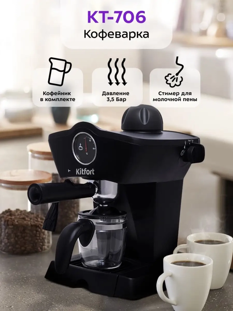 Рожковая полуавтоматическая эспрессо-кофеварка Китфорт КТ-706 может приготовить до 4 чашек кофе за один раз, оснащена функцией взбивания молока для приготовления капучино, а также поможет разогреть напитки горячим паром.
