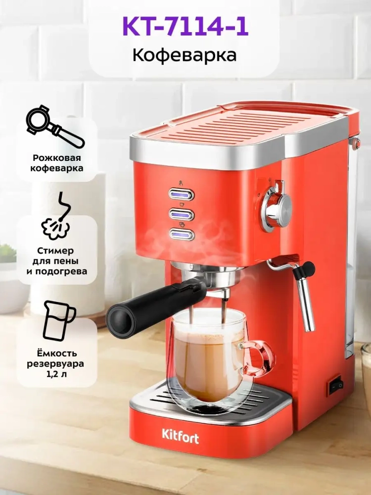Рожковая кофеварка Kitfort КТ-7114 поможет приготовить кофе эспрессо, капучино или латте, а также множество других видов кофе на ваш вкус. С помощью стимера в рожковой кофеварке вы можете подогреть паром остывший чай или молоко.