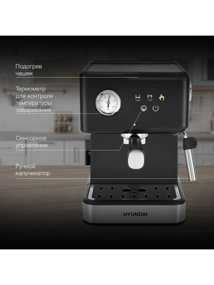 Кофеварка рожковая Hyundai HEM-4204 черный, мощность 1000Вт, используется молотый кофе, давление помпы 20Бар.Классический форм фактор с цветными иконками на сенсорном дисплее, а так же термомтером для контроля температуры заваривания. Программы на 1 и 2чашки, ручная программа для самостоятельного дозирования.