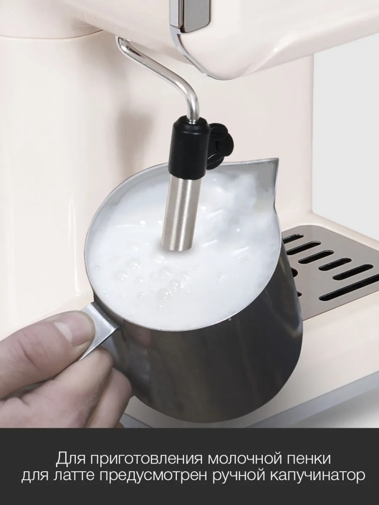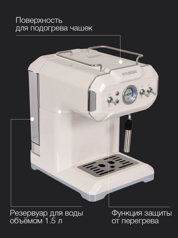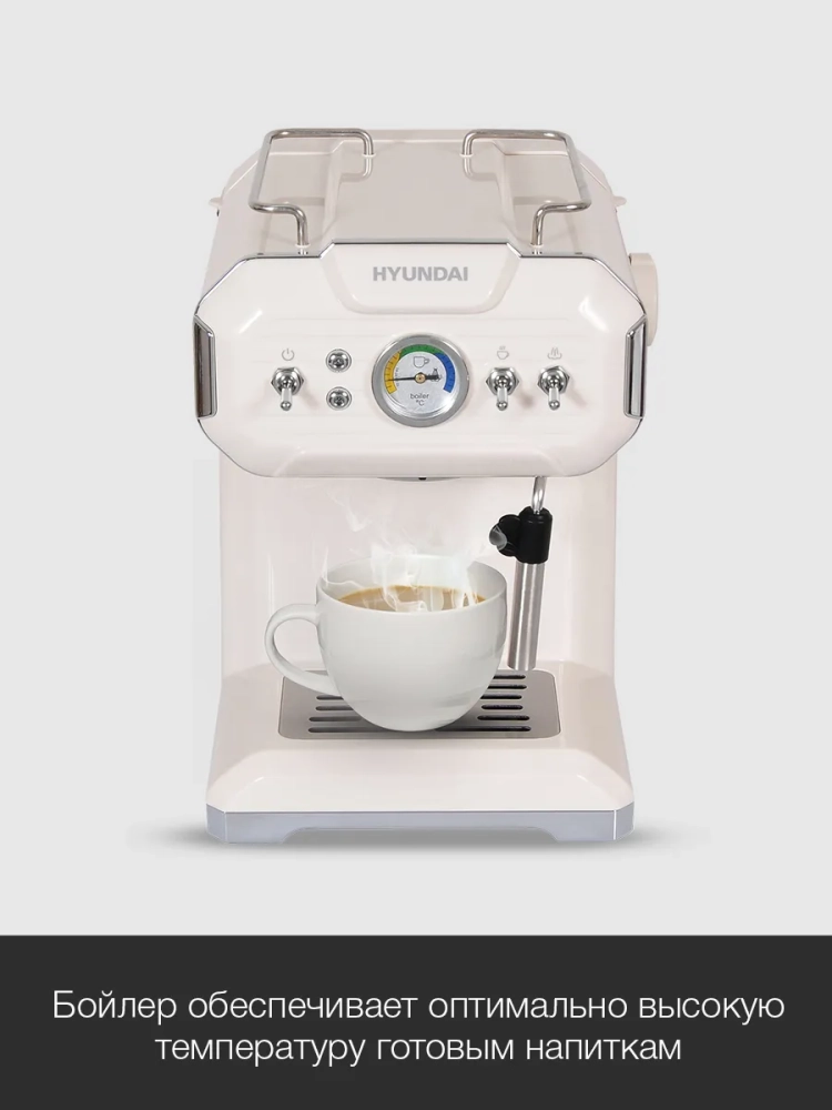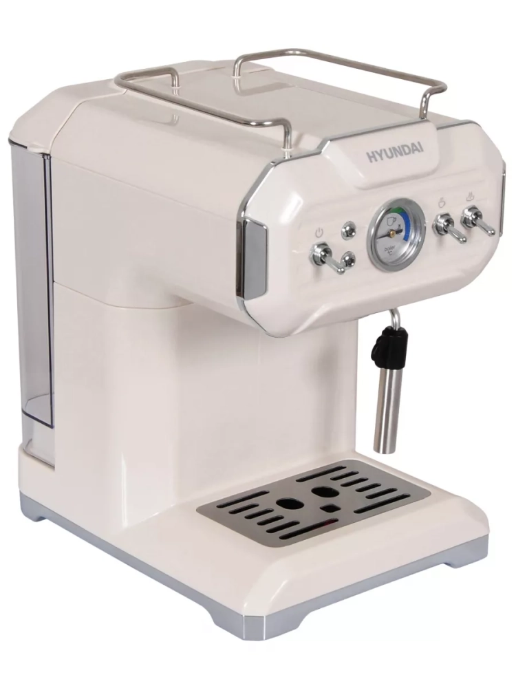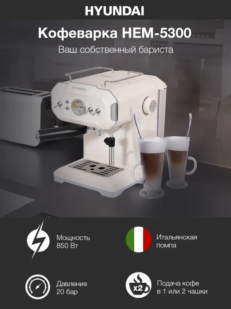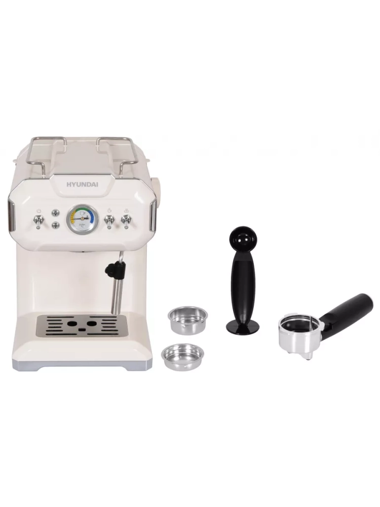 Кофеварка рожковая Hyundai HEM-5300 бежевый/серебристый, мощность 850Вт, используется молотый кофе, давление помпы 20Бар