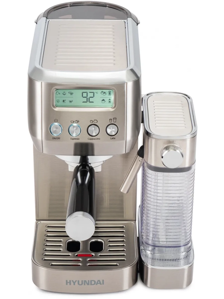 Кофеварка рожковая Hyundai HEM-9999 серебристый, мощность 1350Вт, используется молотый кофе, давление помпы 20Бар.7 программы работы, программирование размера порций, легкосъемный контейнер для молока 0,7л, съемный поддон для капель и резервуар для воды 1,3л, подогрев чашек.Итальянская помпа 20бар с функцией предварительного заваривания для качественного экстрактирования кофе. Профессиональный металлический темпер для правильной прессовки, фильтры на 7 и 14грамм кофе в комплекте.