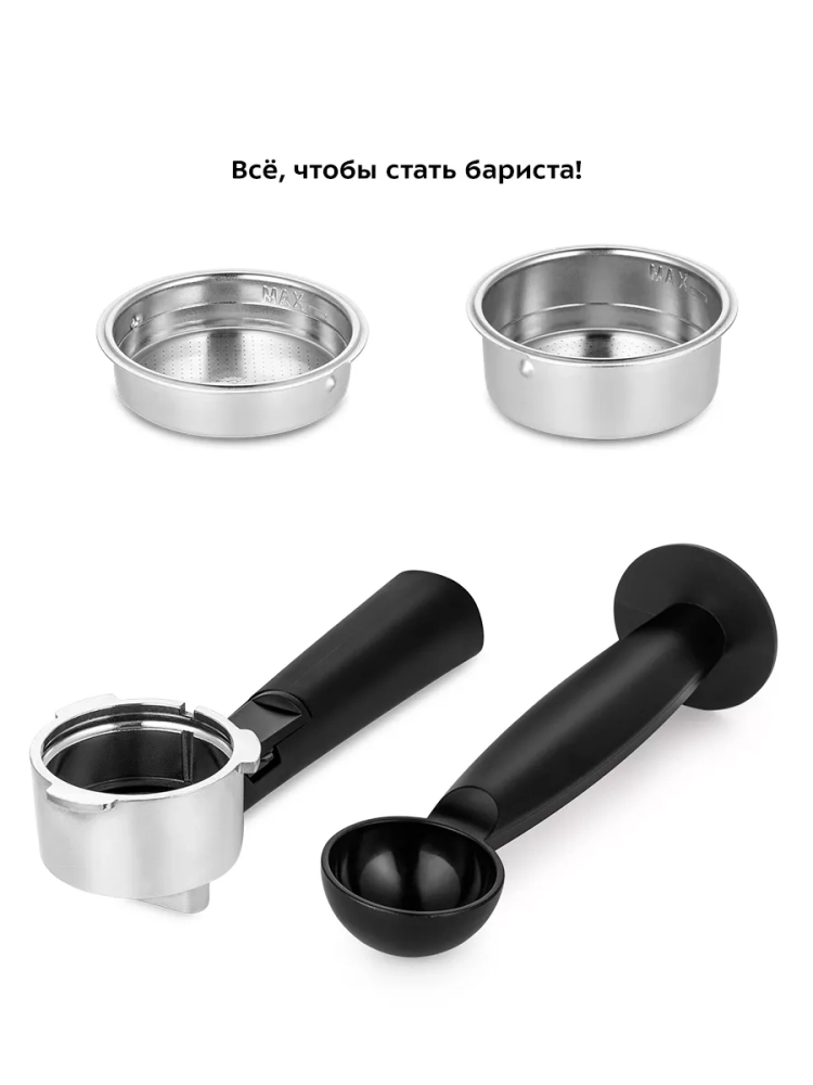 Мерная ложка-темпер поможет наполнить рожок и утрамбовать в нем кофейную таблетку.