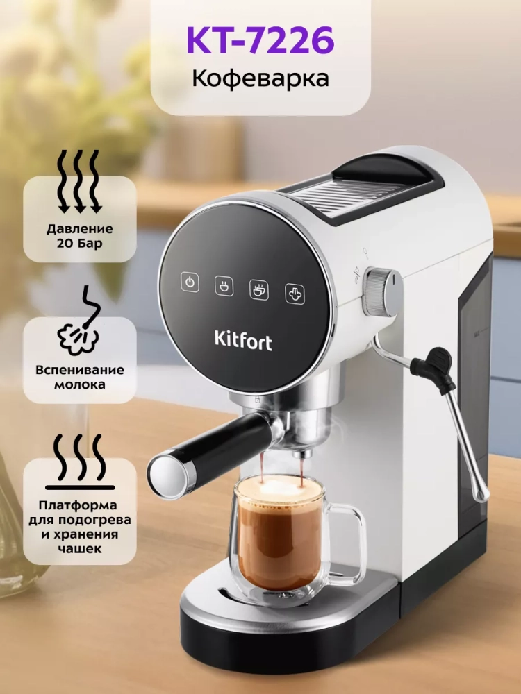 Рожковая кофеварка Kitfort КТ-7226 поможет приготовить кофе эспрессо, капучино или латте, а также множество других видов кофе на ваш вкус. С помощью стимера в рожковой кофеварке вы можете приготовить молочную пенку или подогреть паром остывший чай или молоко.