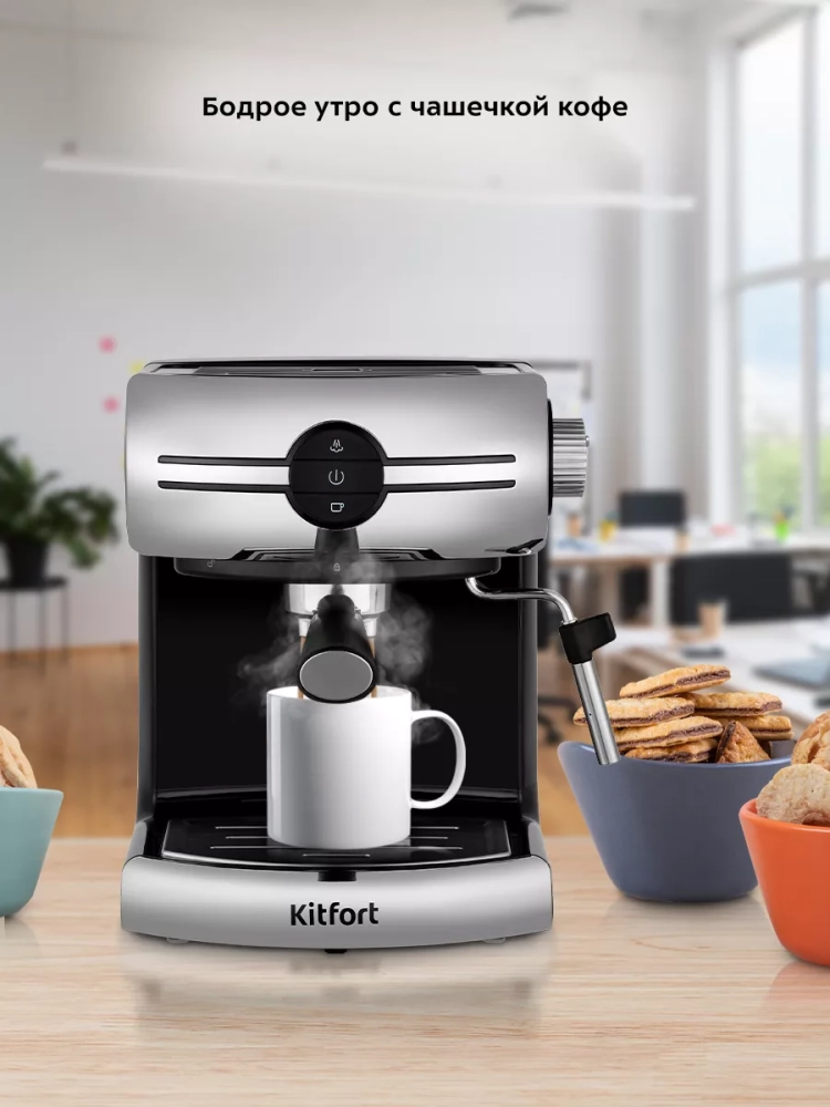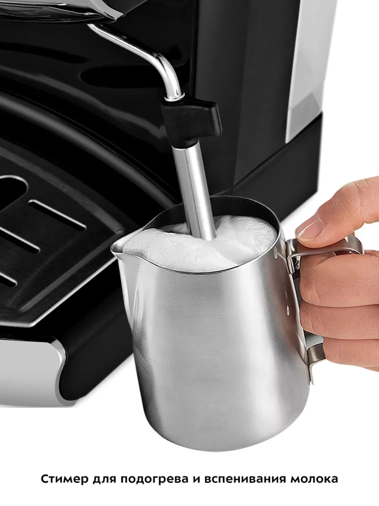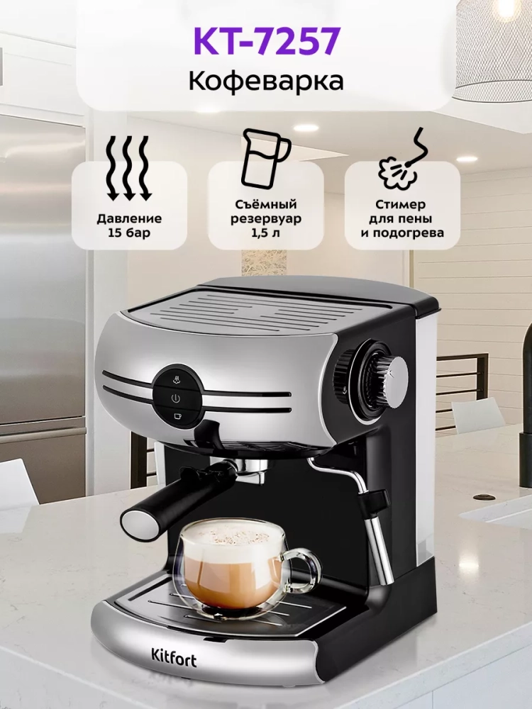 Кофеварка Kitfort КТ-7257 поможет приготовить кофе эспрессо, капучино или латте, а также множество других видов кофе на ваш вкус. С помощью стимера вы можете приготовить молочную пенку, а также подогреть паром остывший чай или молоко.