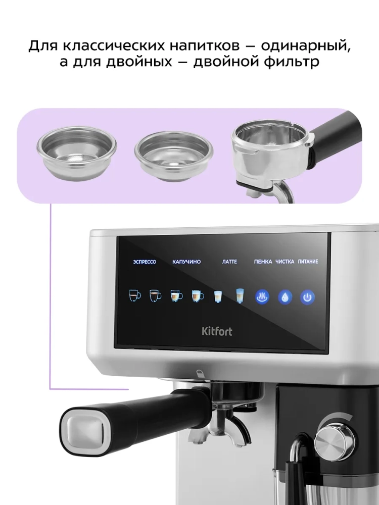 Кофеварка Kitfort КТ-7545 поможет приготовить кофе эспрессо, капучино или латте.