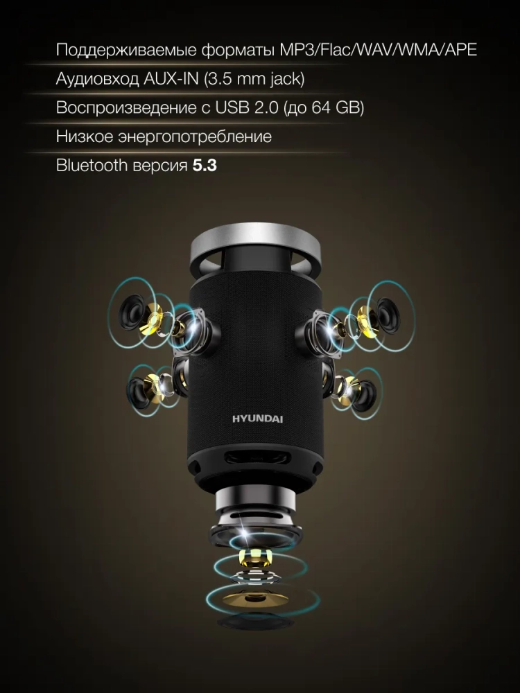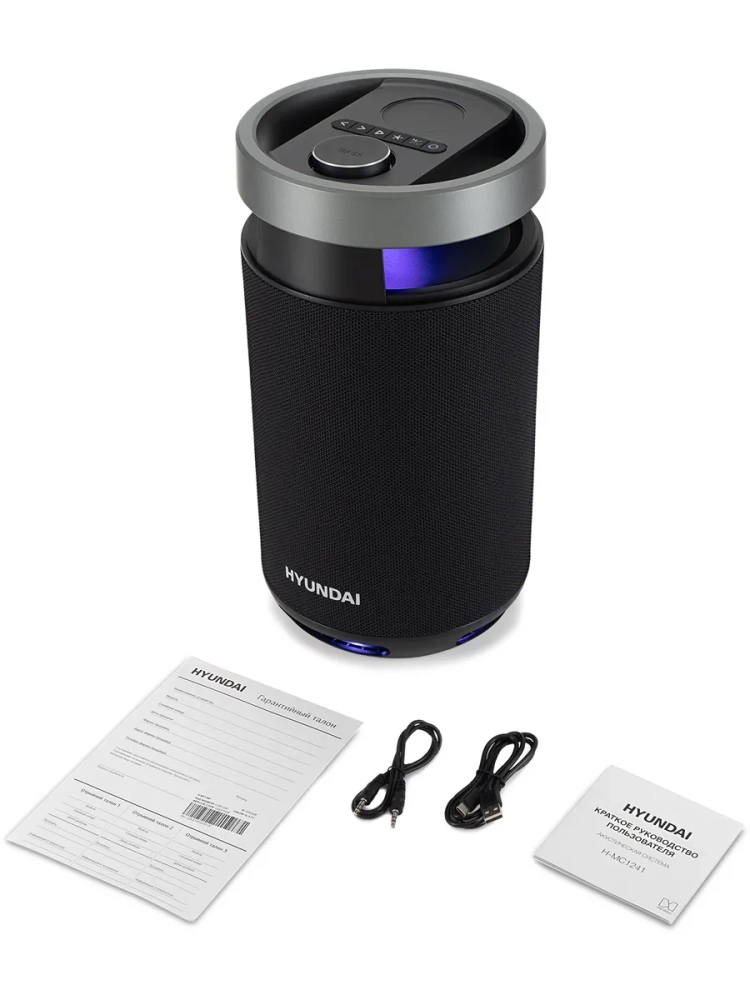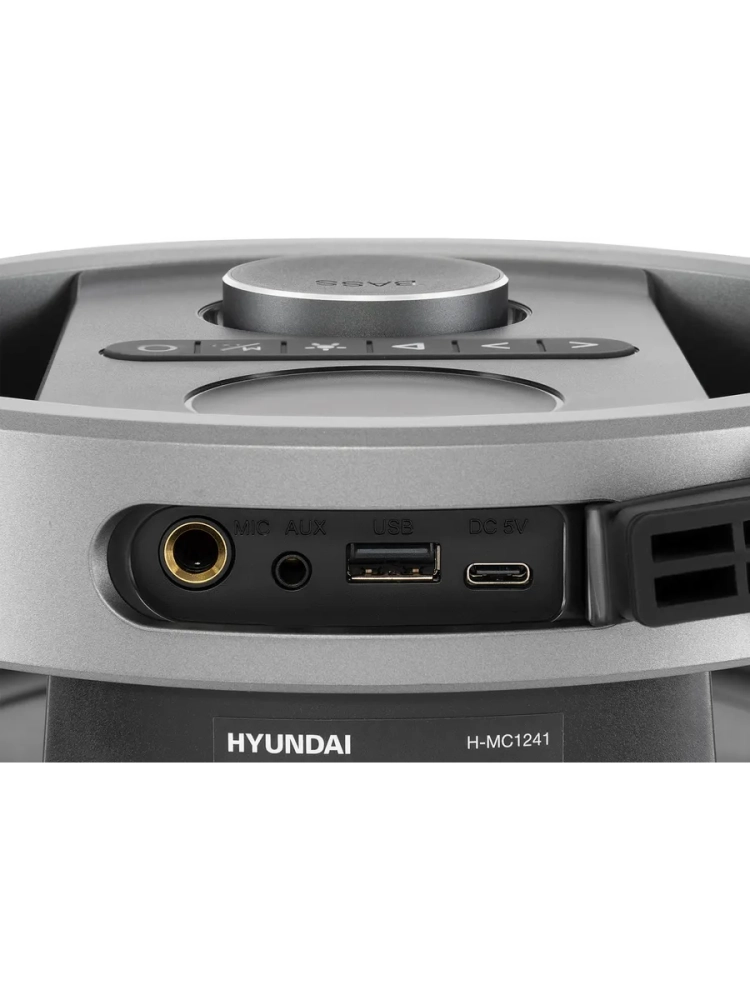 Благодаря поддержке блютуз вы можете легко подключить свой смартфон или планшет. Функция TWS (True Wireless Stereo) позволяет соединить две колонки Hyundai H-MC1241 для создания мощности звука более 200 Вт. Возможно проводное соединение по AUX с медиаплеером и компьютером. Встроенный в колонку проигрыватель, воспроизводит файлы FLAC, WAV, MP3, WMA с USB флешек. Для караоке вечеринок, есть возможность подключения микрофона со штекером 6,33 мм.