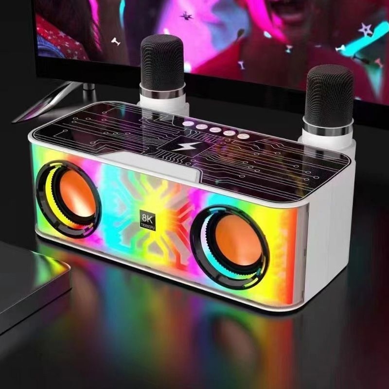 Колонка беспроводная блютуз с караоке. Эта блютуз колонка с микрофоном станет вашим незаменимым спутником в любом путешествии или домашнем отдыхе. С помощью технологии bluetooth вы сможете легко подключить свой смартфон или планшет и наслаждаться вашей любимой музыкой в любое время и в любом месте. Небольшая и компактная, эта мини караоке система поместится в любую сумочку или рюкзак, что делает ее идеальным выбором для путешествий и активного отдыха. Но это еще не все! Наша маленькая колонка имеет два микрофона, которые позволяют вам вести караоке дома или в компании друзей. Вы сможете исполнять свои любимые песни и наслаждаться превосходным качеством звука. А так же ее можно использовать как зарядное устройство для телефона. Просто положив сверху свой смартфон. Устройство оснащено лампой с подсветкой, которое создаст уютную атмосферу и подарит вам незабываемые вечера в кругу близких и друзей. Благодаря аккумулятору вы сможете использовать ее длительное время без подзарядки. Подходит как для детей, так и для взрослых. Она идеальна для детской вечеринки, подростковых посиделок. А специальная функция "искажение голоса" добавит яркости и веселья вашим караоке выступлениям.