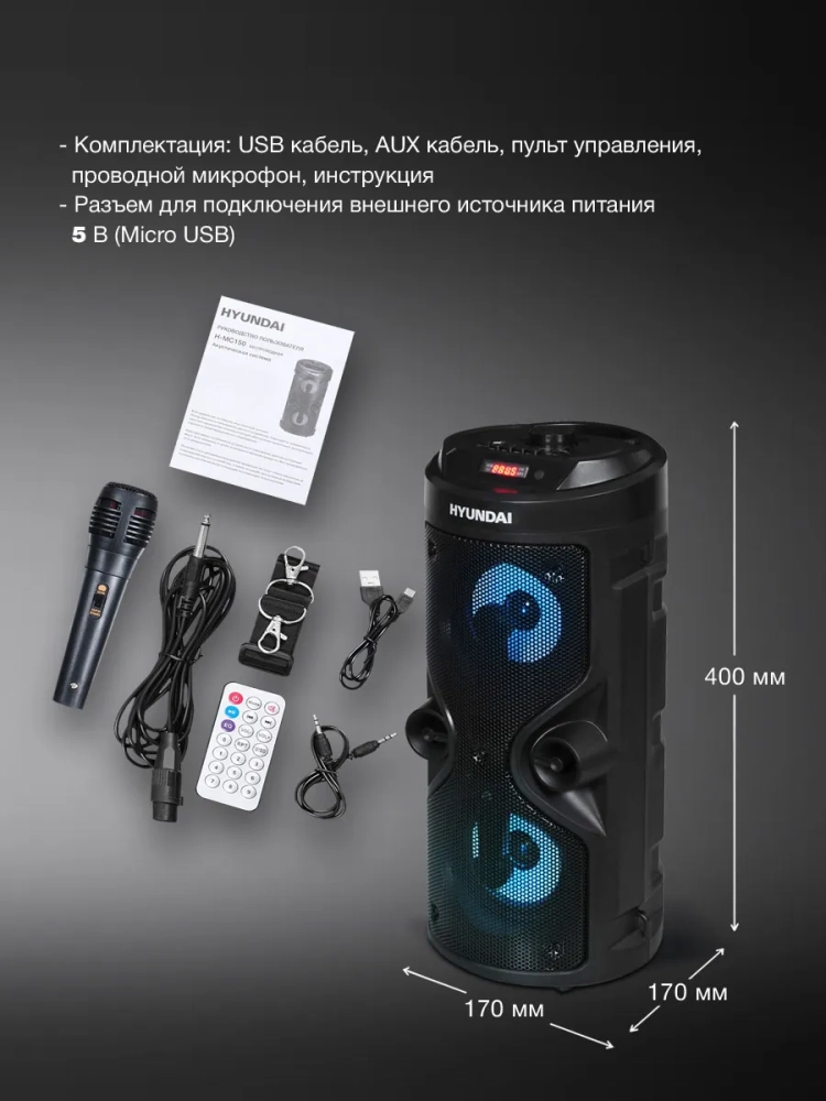 Hyundai H-MC150 также предлагает функцию караоке, чтобы вы могли исполнять свои любимые песни и создавать веселье вместе с друзьями и семьей. Кроме того, она оснащена встроенным радиоприемником и возможностью воспроизведения музыки с флеш-накопителей, чтобы вы могли наслаждаться разнообразием радиостанций и своими любимыми мелодиями.