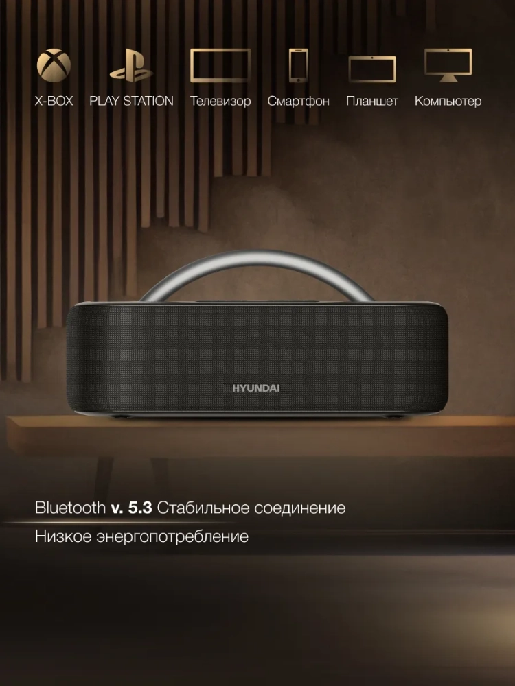 Колонка портативная Hyundai H-PS1028 черный, мощность 60Вт, акустический тип 2.0, интерфейс подключения BT, питание от аккумулятора. Проекция звездного неба