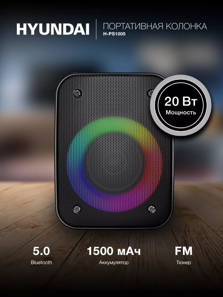 RGB-подсветка динамиков обеспечивает яркое световое сопровождение для воспроизводимой Hyundai H-PS1005 музыки
