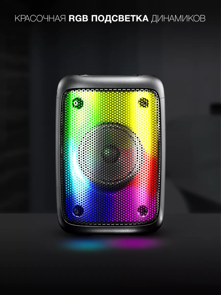 Воспроизведение музыки на Hyundai H-PS1006 сопровождается светомузыкой из RGB-подсветки, встроенной в переднюю панель. Для удобства переноски колонка имеет удобную ручку на верхнем ребре.