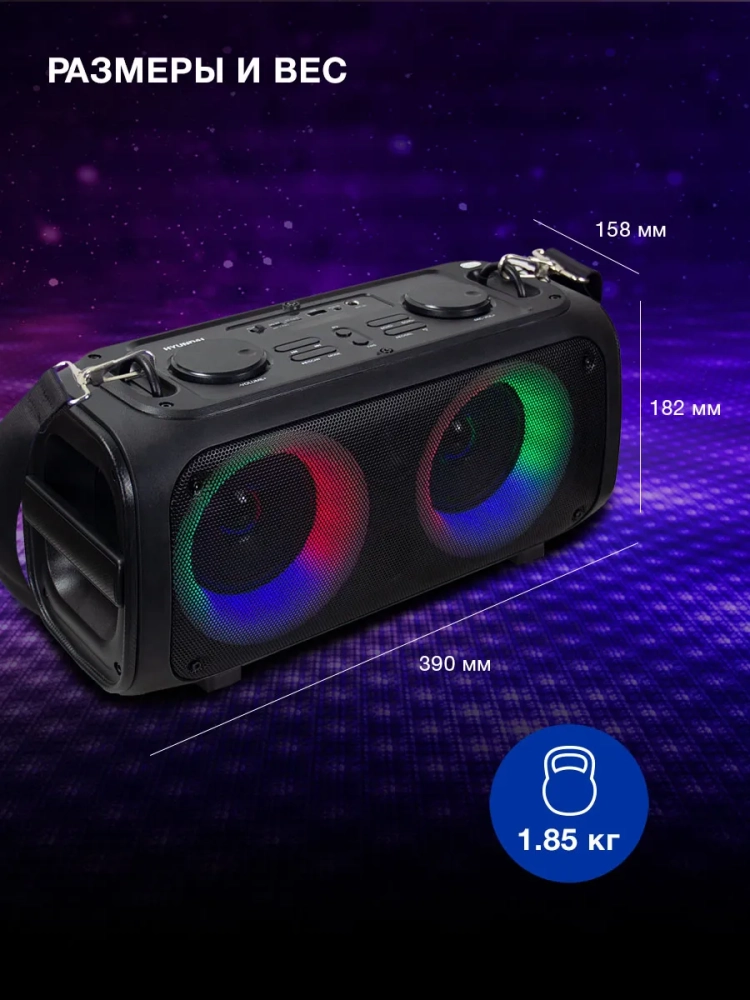 Портативная акустика Hyundai H-PS1030 – это полноценный мультимедийный центр с яркой RGB-подсветкой.