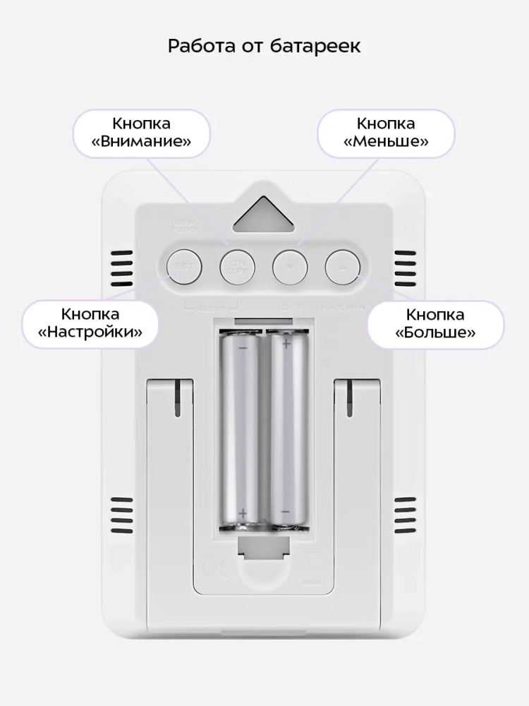 Комнатный термогигрометр работает от 2 батареек типа AAA (не входят в комплект), благодаря чему его можно расположить в любом удобном для вас месте. Прибор можно повесить на стену или поставить на стол. На задней части устройства расположено отверстие для настенного крепления и складная ножка.