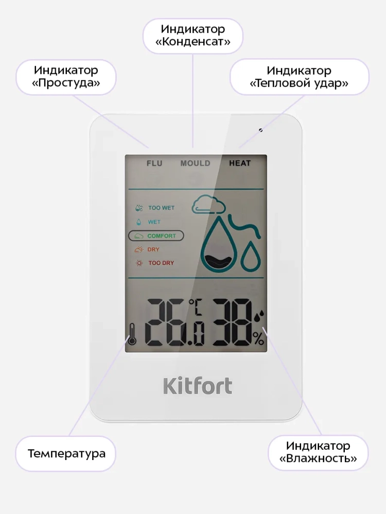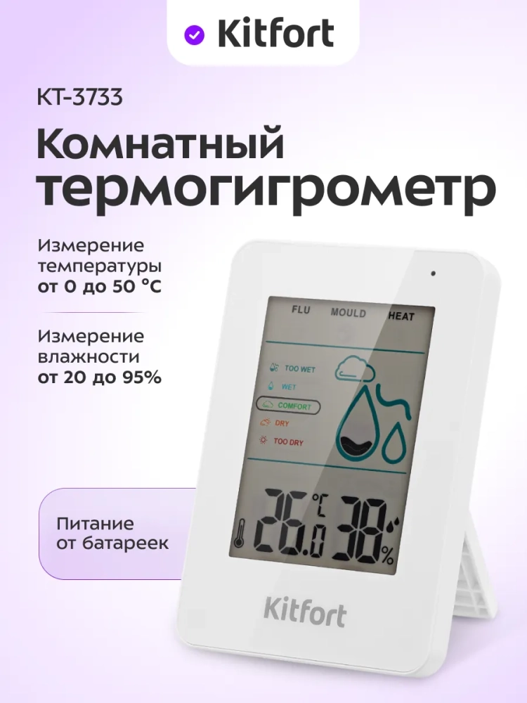 Комнатный термогигрометр Kitfort KT-3733 — устройство, позволяющее следить за изменениями температуры и влажности в помещении. В данной модели есть возможность выбрать единицы измерения температуры: градусы Цельсия (°С) или Фаренгейта (°F).