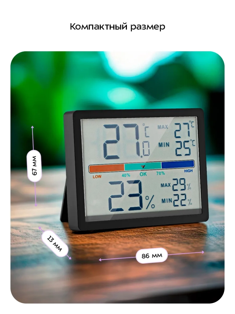Благодаря компактному размеру и стильному дизайну термогигрометр легко впишется в ваш интерьер.