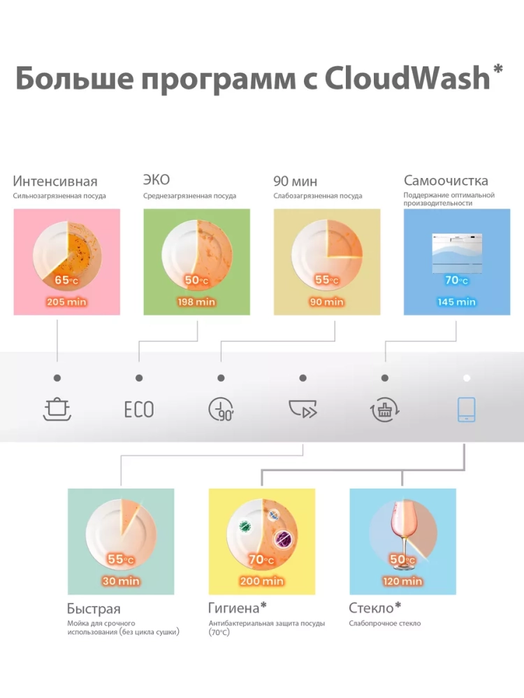 Машина оснащена электронным управлением, позволяющим выбрать одну из шести программ мойки, включая быструю, интенсивную и экономичную. Вы можете установить таймер отсрочки запуска до 24 часов, чтобы запустить мойку в удобное для вас время.