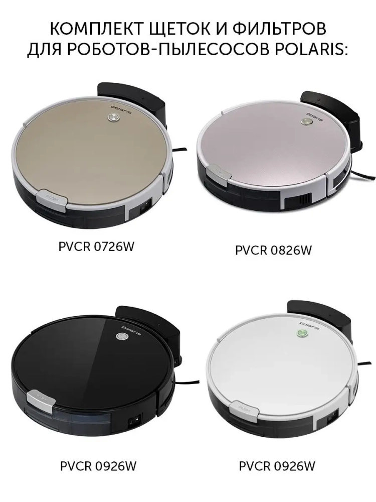 Сменный комплект аксессуаров, совместимых с роботами-пылесосами моделей PVCR 0726W (арт. 6170053) / PVCR 0826 (арт. 6170054) / PVCR0926W (арт. 31211424 / 5163995) / **PVCR 0735 IQ Home (арт.** 40895805). В комплект входят фильтр, пара боковых щёток, микрофибра для влажной уборки. Аксессуары следует заменять для продления срока службы робота-пылесоса.