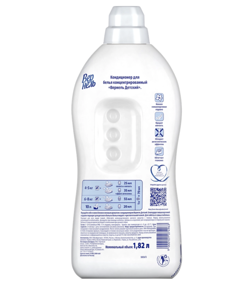 Кондиционер для детского белья ВЕРНЕЛЬ Детский, 1.82л Производитель OOO «ЛАБ Индастриз» Количество стирок 60 Меры предосторожности Избегайте непосредственного контакта средства для стирки с тканью. Условия хранения При температуре от +5 до +40. Вид упаковки Пластиковая бутылка. онцентрированный кондиционер для детского белья ВЕРНЕЛЬ Детский, 60 стирок предназначен для стирки детского белья, а также одежды людей с чувствительной кожей и склонных к аллергии. Концентрированный кондиционер для белья подарит белью не только невероятную мягкость, но и легкий пробуждающий аромат. Средство ВЕРНЕЛЬ имеет концентрированную формулу, обеспечивающую мягкость и свежесть белью. Благодаря специальным аромакапсулам в составе кондиционер для стирки ВЕРНЕЛЬ позволит наслаждаться интенсивным ароматом белья до 140 дней. Кондиционер для стирки облегчает глажку и обладает антистатическим эффектом. Кондиционер ВЕРНЕЛЬ идеально подходит для регулярного ухода за бельем, благодаря эффективности и простоте использования. На одну стирку достаточно меньше половины колпачка средства ВЕРНЕЛЬ. Благодаря удобной крышке-дозатору вы всегда будете знать, сколько ополаскивателя для белья необходимо добавить в отделение для кондиционера в стиральной машине или в воду во время последнего полоскания при ручной стирке. Кон Состав: 5–15% катионных ПАВ, 5% отдушки, консерванта, пеногасителя.