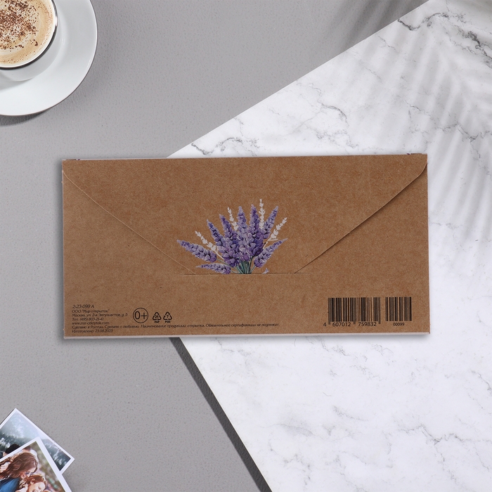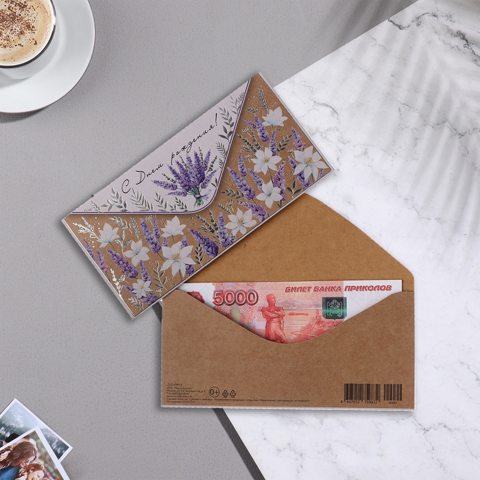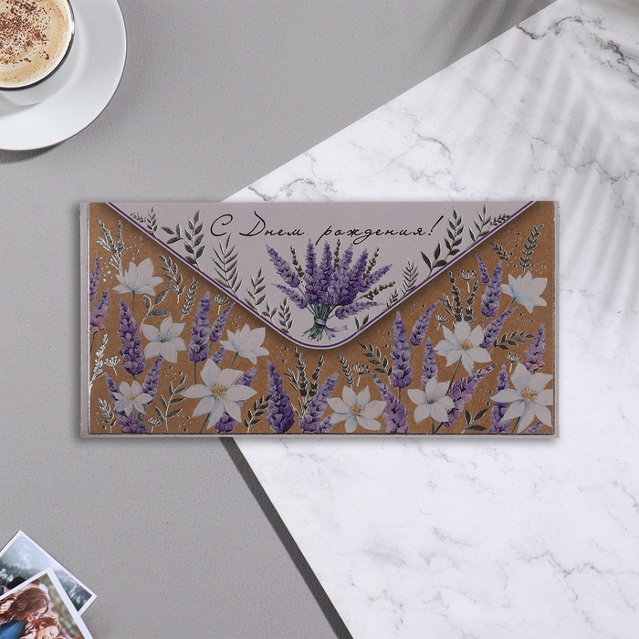 Конверт для денег "С Днём Рождения!" крафт, тиснение, лаванда, 17х8 см