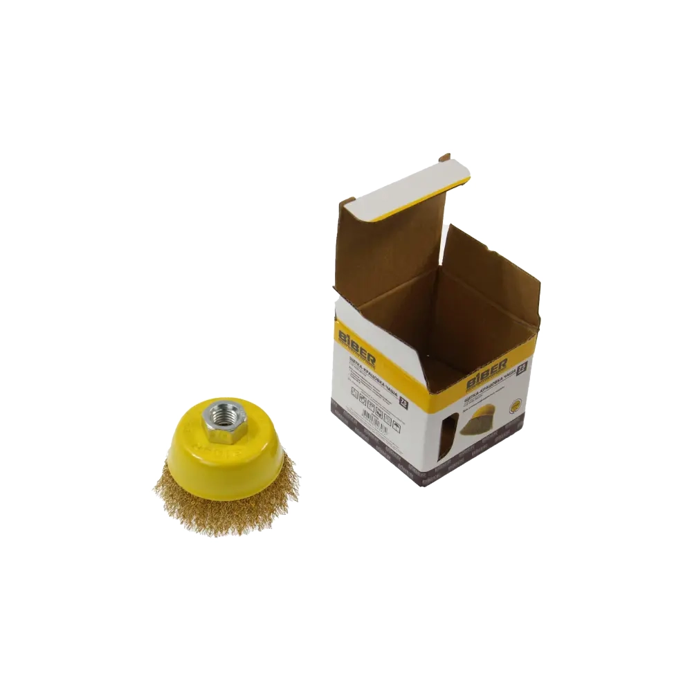 Кордщетка-чашка, гайка М14, стальная латунированная волнистая проволока 75 мм, Biber 70970
